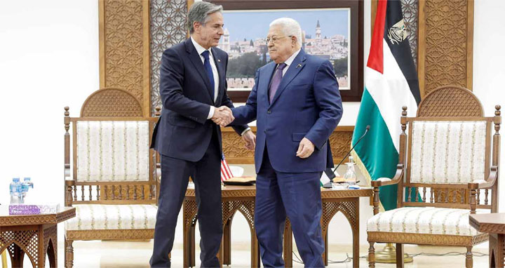 রোববার পশ্চিম তীর অঞ্চল সফরে যান ব্লিনকেন। সেখানে রামাল্লা শহরে ফিলিস্তিনের প্রেসিডেন্ট মাহমুদ আব্বাসের সঙ্গে এক ঘণ্টারও বেশি সময় তিনি বৈঠক করেন। সেই বৈঠকে তিনি বলেন, গাজা উপত্যকার নিয়ন্ত্রণকারী গোষ্ঠী হামাসকে নিশ্চিহ্ন করার আগ পর্যন্ত ইসরায়েল থামবে না এবং যুদ্ধ শেষে ইসরায়েল গাজার দখলও নেবে না। তাই সে সময় পশ্চিম তীরে ক্ষমতাসীন সরকার বা ফিলিস্তিনি কর্তৃপক্ষ (পিএ) জোটকে গাজার দায়িত্ব নিতে হবে।