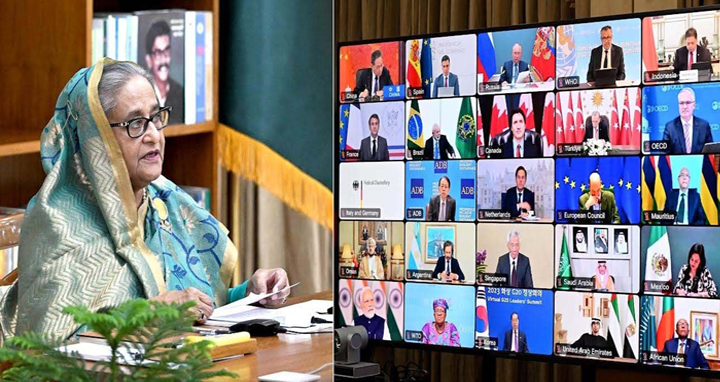 বুধবার (২২ নভেম্বর) সন্ধ্যায় গণভবন থেকে ভার্চুয়াল প্ল্যাটফর্মে ভারতের নয়াদিল্লিতে অনুষ্ঠিত ‘জি২০ লিডারস সামিট ২০২৩’-এ বক্তৃতাকালে প্রধানমন্ত্রী একথা বলেন।