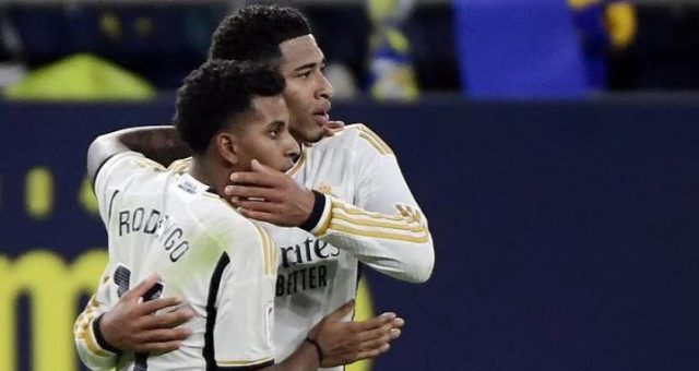 এক মিনিট পর অবশ্য ঠিকই নিজের এবং দলের দ্বিতীয় গোলটি আদায় করে নেন রদ্রিগো। কাদিজের তিন খেলোয়াড়কে বোকা বানিয়ে বক্সের ঢুকে নিখুঁত শটে লক্ষ্যভেদ করেন তিনি। এরপর ৭৪ মিনিটে করা বেলিংহামের গোলটিও এসেছে রদ্রিগোর সহায়তা থেকে। সব মিলিয়ে রিয়ালের শীর্ষে ওঠার রাতটাকে এককভাবেই নিজের করে নিয়েছেন রদ্রিগো।