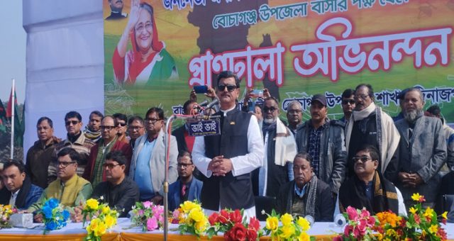 গতকাল ২৭ জানুয়ারি শনিবার সকাল ১১টায় সেতাবগঞ্জ শেখ রাসেল মিনি স্টেডিয়ামে বোচাগঞ্জবাসীর পক্ষ থেকে পুনরায় নৌ প্রতিমন্ত্রীর দায়িত্ব পাওয়ায় ফুলেল শুভেচ্ছা ও প্রাণঢালা অভিনন্দন প্রদান অনুষ্ঠানে প্রধান অতিথির বক্তব্যে তিনি একথা বলেন। বোচাগঞ্জ উপজেলা অওয়ামী লীগের সভাপতি আবু সৈয়দ হোসেন এর সভাপতিত্বে ও সাধারন সম্পাদক মোঃ আফছার আলীর সঞ্চালনায় বিভিন্ন রাজনৈতিক সংগঠন, সামাজিক সংগঠন, সাংস্কৃতিক সংগঠন, শিক্ষা প্রতিষ্ঠান, প্রেসক্লাব, বিভিন্ন স্তরের মানুষ নৌ প্রতিমন্ত্রী খালিদ মাহমুদ চৌধুরী এমপিকে ফুলেল শুভেচ্ছা ও অভিনন্দন জানান।