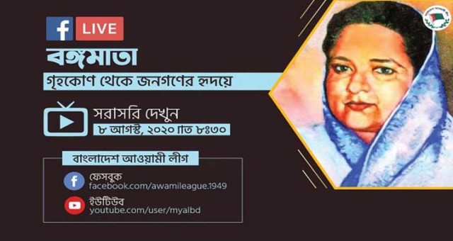 জাতির পিতা বঙ্গবন্ধু শেখ মুজিবুর রহমানের সহধর্মিণী বঙ্গমাতা শেখ ফজিলাতুন্নেসা মুজিবের ৯০তম জন্মবার্ষিকী আজ। এ উপলক্ষে আজ ৮ আগস্ট রাত সাড়ে ৮টায় আওয়ামী লীগ ভার্চুয়াল পদ্ধতিতে আয়োজন করতে যাচ্ছে ‘গৃহকোণ থেকে জনগণের হৃদয়ে’ শীর্ষক বিশেষ ওয়েবিনার।