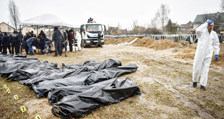 ইউক্রেনের রাজধানী কিয়েভের কাছে রোববার এক হাজার দুশ’র বেশি মরদেহ পাওয়া গেছে বলে দেশটির পক্ষ থেকে দাবি করা হয়েছে। গত মাসে রাশিয়া ইউক্রেনে হামলা চালানোর পর থেকে এখন পর্যন্ত ওই অঞ্চলে বহু বেসামরিক নিহত হয়েছে। বিভিন্ন শহর ছেড়ে লাখ লাখ মানুষ পালাতে বাধ্য হয়েছে।