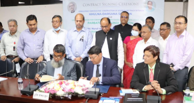 দিনাজপুরের পার্বতীপুর থেকে রংপুরের কাউনিয়া পর্যন্ত মিটারগেজ রেললাইনকে ডুয়েলগেজে রূপান্তর এবং খুলনা-দর্শনা সেকশনে নতুন ব্রডগেজ রেললাইন নির্মাণ প্রকল্পের কনসালটেন্সি সার্ভিসের সঙ্গে চুক্তি সই হয়েছে। ভারতীয় এলওসির অর্থায়নে প্রকল্প দুটি সম্পন্ন হবে। আজ বৃহস্পতিবার (২৫ আগস্ট) রেলভবনে এ চুক্তি সই হয়।